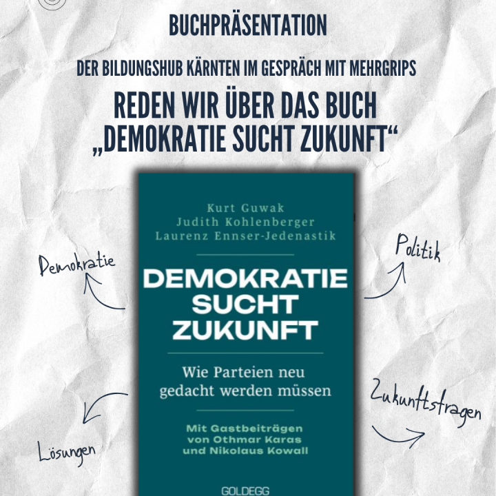 Am 13.11.2025, von 17:00–19:00 Uhr, lädt der Bildungshub Kärnten zu einer spannenden Diskussion über das neue Buch „Demokratie sucht Zukunft“ (erscheint am 08.11.) ein.